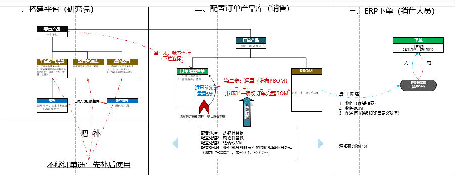 企业研发人员通过创建系列化产品平台,搭建平台配置清单,配置方法库,颜色配置库等信息,市场部人员获取客户订单后,将客户的订单需求转换成订单产品的配置清单录入到PLM系统,由PLM系统自动生成PBOM,并通过ERP接口传到ERP系统进行下单生产,整个过程无需技术人员对订单进行图纸设计,工艺设计,可极大提升效率。