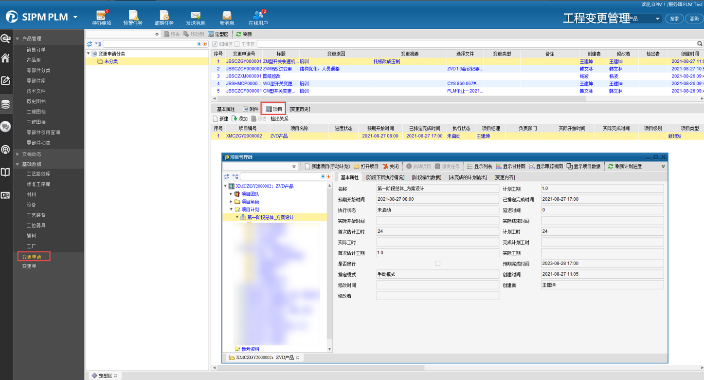 工程变更:PLM发起变更申请并维护工程变更项目;变更申请审批通过后,启动变更项目并下发变更任务到相关专业工程师按要求进行数据变更。