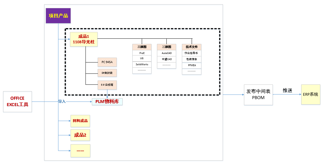 2) 以BOM为中心实现技术资料(含图纸)关联管理,打通技术数据和ERP系统的互通;
