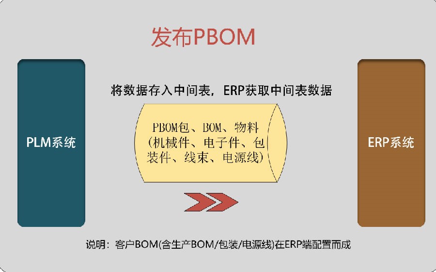 7) 发布PBOM管理:通过PBOM发布管理,将PLM的物料、BOM数据存入中间表,可供ERP实时获取。