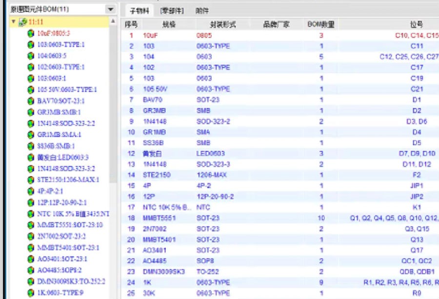 3) 电子物料与原理图通过字段“封装形式”“规格”匹配生成产品结构BOM