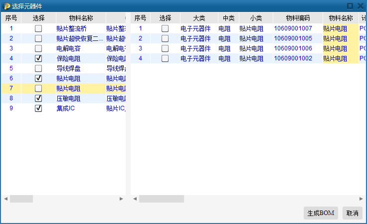 通过参数匹配,实现从电子设计BOM到电子生产BOM的匹配生成;