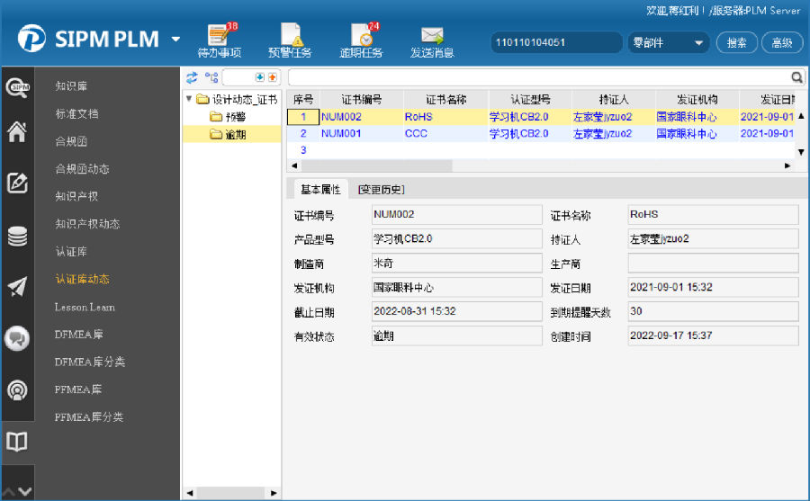在SIPM/PLM中建认证库,按产品方向、项目建视图自动分类;按项目与申请资料、认证资料、认证证书相关联,便于查找;设置预警、报警动态,按设定的有效期提前期间自动示警和报警;