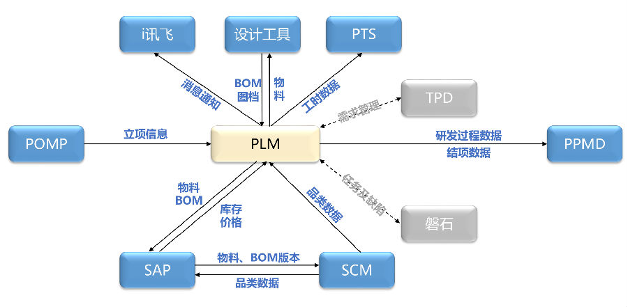 PLM与POMP的集成,从项目监管部门获取立项信息;与PPMD集成,传递里程碑数据;与i讯飞集成,向办公平台传送PLM的消息;与PTS集成,传送工时数据;与SCM集成,互通物料数据。