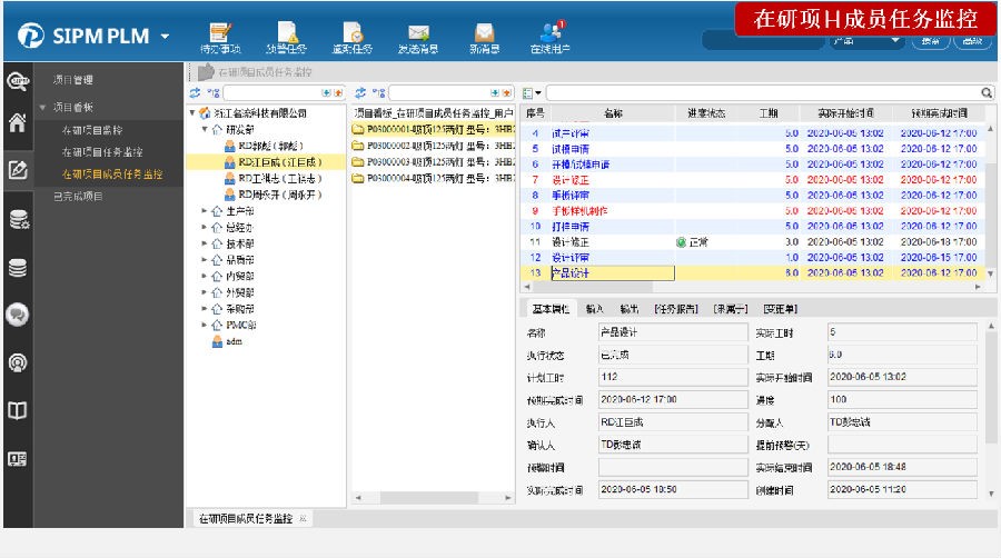 在研项目成员任务监控:可动态呈现某用户所承担的项目,以及在该项目中所承担的任务,以及任务状态,并以红绿灯方式显示任务状态,方便任务进度掌控。