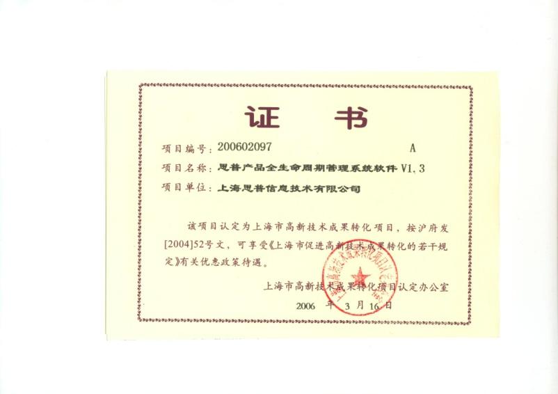 2006-03-01 思普荣誉 上海市高新技术成果转化项目