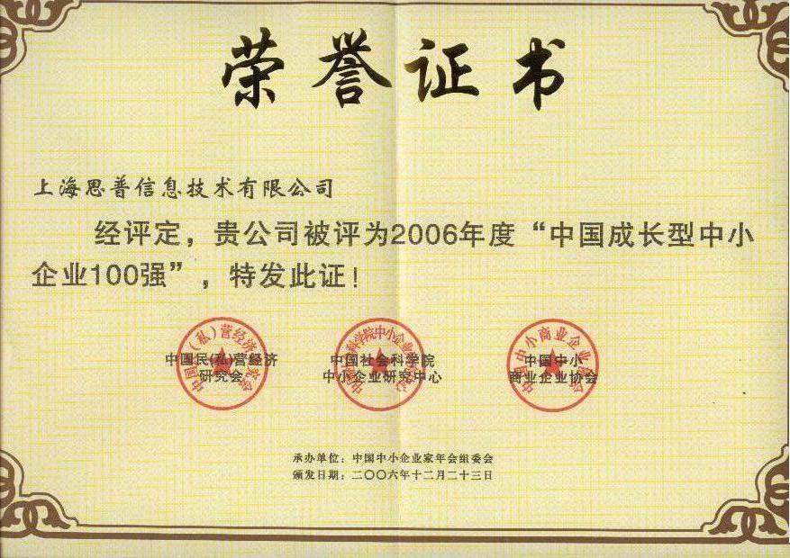 2006-12-20 思普荣誉 中国成长型中小企业100强