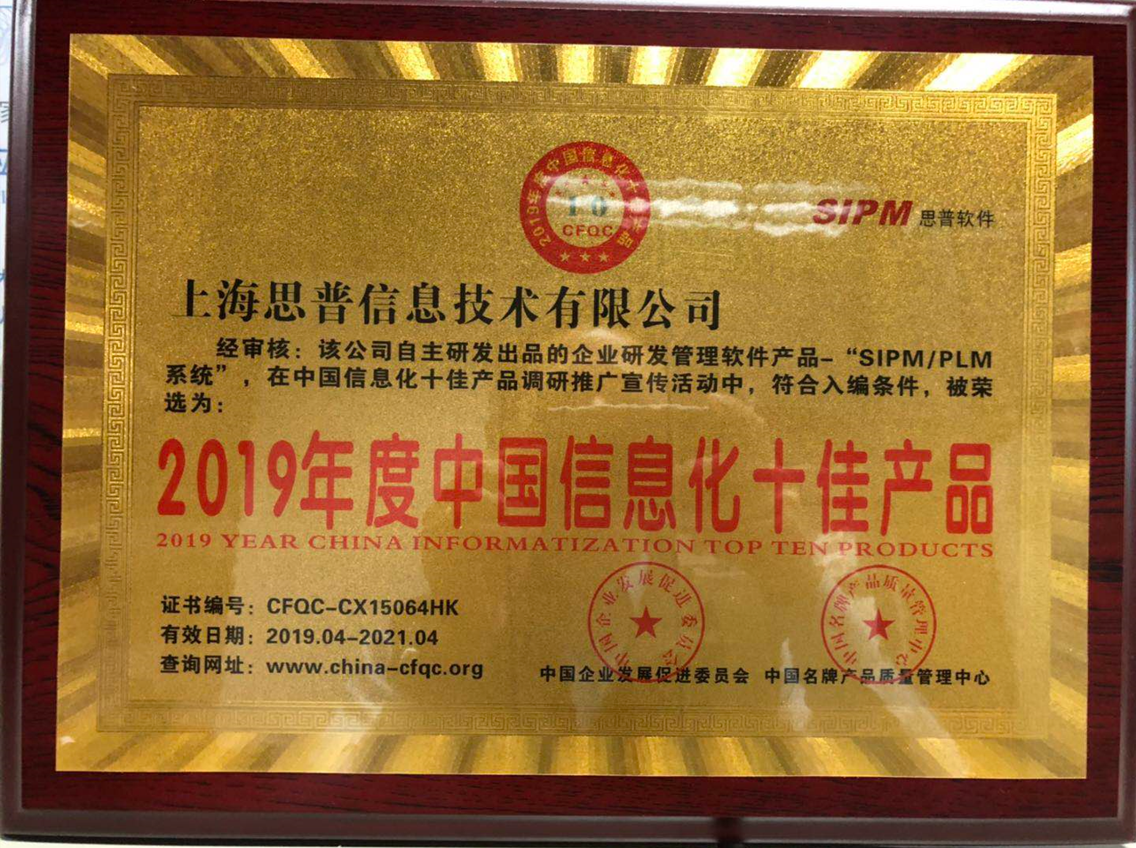 2019-04-12 思普PLM系统荣获 2019年度中国信息化十佳产品